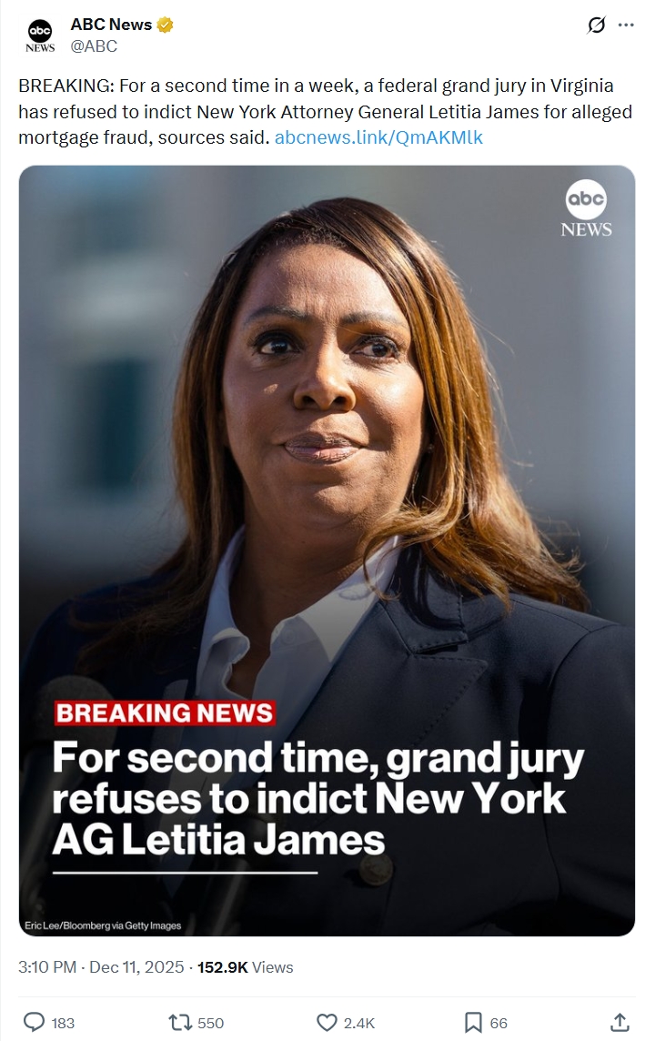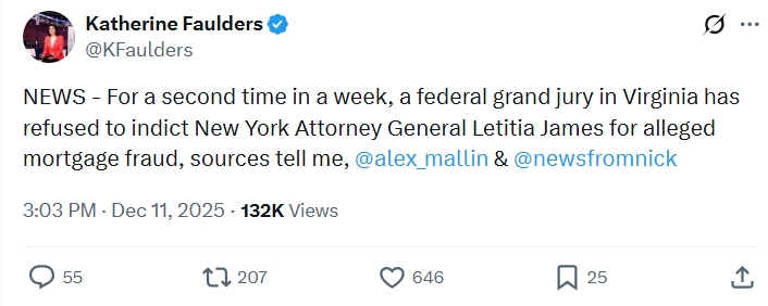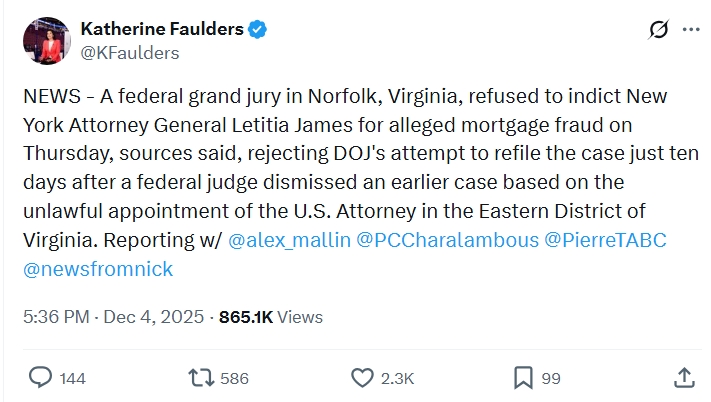 By 5:36 PM, Katherine Faulders was on X: “NEWS – A federal grand jury in Norfolk, Virginia, refused to indict New York Attorney General Letitia James for alleged mortgage fraud on Thursday, sources said…”