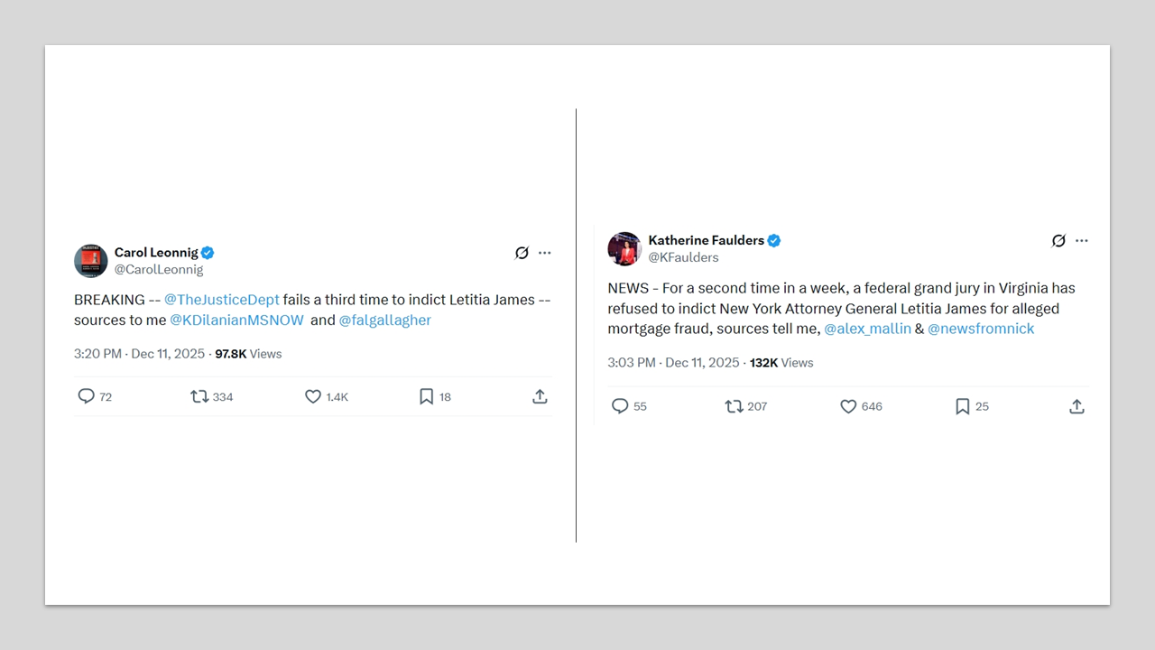 At 3:03 PM that same day, Faulders tweeted: “NEWS – For a second time in a week, a federal grand jury in Virginia has refused to indict New York Attorney General Letitia James for alleged mortgage fraud, sources tell me.”