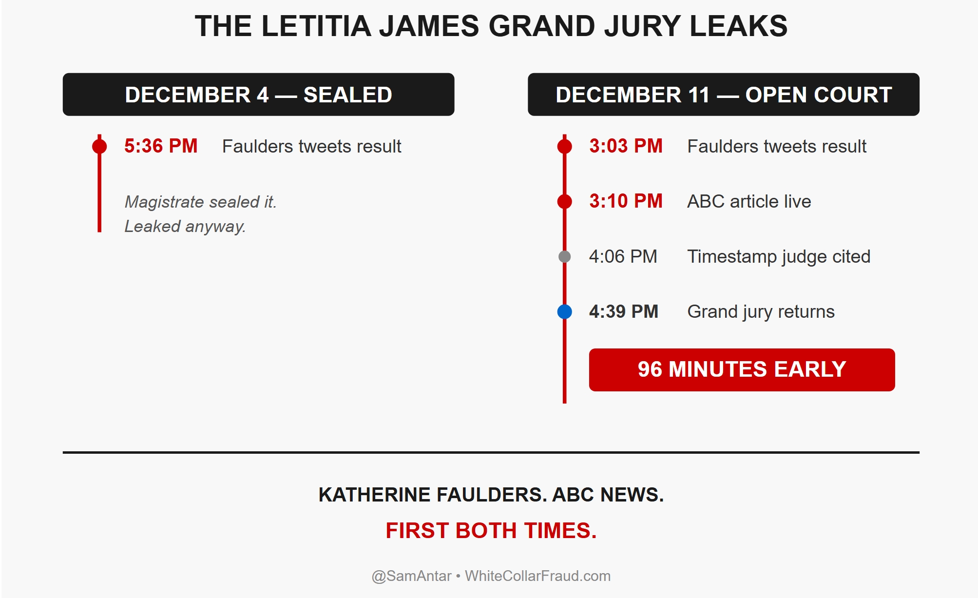 Last week, I published “The Letitia James Grand Jury Leak: 33 Minutes Early. A Federal Judge Put It in Writing.” I documented how Judge Porter cited a 4:06 PM ABC News article – authored by Katherine Faulders – that published the December 11 grand jury result before the 4:39 PM return in open court. (Click on any image to enlarge.)